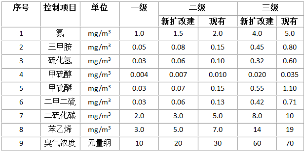 考虑到恶臭气体的危害,对于恶臭无组织排放有相关限值,在新建、扩建、改建的建设项目中在后期的投产企业执行二级、三级标准中的相应标准值。